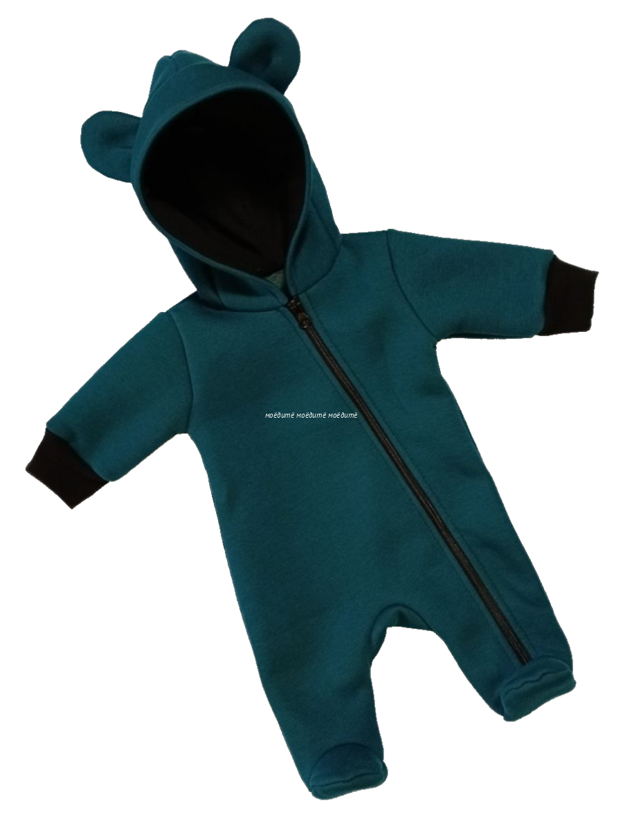 Комбинезон с закрытыми ножками, с капюшоном на подкладке, на молнии по всей длине и до конца одной ножки.